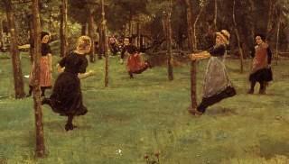 Dieses Spiel hat Max Liebermann in eines seiner Bilder aufgenommen, die er während seiner sommerlichen Holland-Aufenthalte im Dorf Zweelo malte. Das Bild zeigt die heitere Stimmung in einem mit hellen Grüntönen dargestellten Baumgarten. Seine Motive, die Mädchen, posieren nicht,sondern widmen sich ganz natürlich ihrer Beschäftigung.