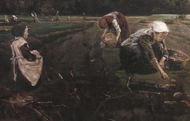 Wegen seiner hellen Kleidung, die in deutlichem Kontrast zur dunklen Farbgestaltung des Bildes steht, sowie seiner betonten Position im Bilde, fällt uns die Figur des kleinen Mädchens besonders auf. Die Anwesenheit kleiner (noch) nicht mitarbeitender Kinder sowie das Beobachten der Erwachsenen bei der Arbeit diente oftmals dem Zweck, die Kinder an ihre späteren Aufgaben bei der Feldarbeit heranzuführen. Vielleicht trägt das kleine Mädchen schon jetzt seinen Teil zur gemeinschaftlichen Arbeit bei, indem es die Schürze aufhält, damit Kartoffeln hineingelegt werden können. |