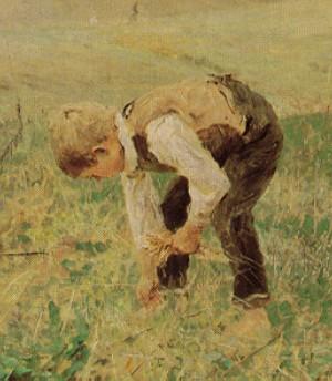 So kam es vor, daß die in der Landwirtschaft arbeitenden Kinder zwar acht bis neun Jahre Schulunterricht erhielten, als Erwachsene jedoch kaum lesen und schreiben konnten. Wenn Uhde dem Betrachter ein arbeitendes Kind zeigt, schleicht sich ein sozialer Fingerzeig ins Bild