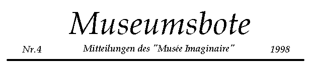 Zum Jahresende 1998 erreichte mich eine e-mail aus Moskau, in der eine dortige Studentin sehr umfangreich über ihren "Besuch" im Musée Imaginaire berichtete und mir einige Fragen stellte, die ich zum Anlaß genommen habe, noch einmal grundlegend über das Musée Imaginaire, seinen Aufbau und Umfang sowie über "veränderte Kindheit" nachzudenken.