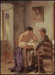 "Ein Mädchen und ein Junge sitzen in einer sonnigen Stube an einem Tisch. Es ist ganz ruhig. Das Mädchen liest, den Kopf aufgestützt, der Junge sitzt bequem auf einem Stuhl und schaut vor sich hin. Vielleicht bekommt er etwas vorgelesen. Das Zimmer ist einfach eingerichtet; ein Tisch, Holzstühle mit geflochtenen Strohsitzen, ein Spinnrad, an der Wand zwei Bilder und ein Kruzifix. Auf dem Holzboden liegen keine Teppiche. Das Zimmer sieht gemütlich aus. Das machen die hellen, in der Sonne leuchtenden Farben. Thoma hat sie sorgfältig in dem Bild verteilt. Blau fällt als erstes im Rock des Mädchens auf, aber dann auch in der Schleife am Spinnrad. Gelb erscheint in der Bluse und am Vorhang, ein wenig Rosarot an der Gardinenborte und an den Strümpfen des Jungen.