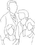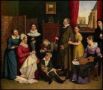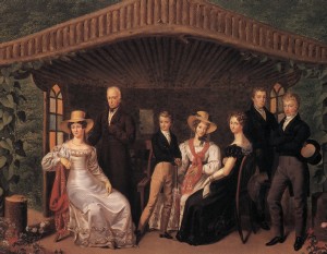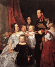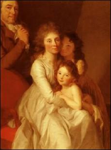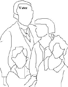 (Soiné, Knut: Joh.Peter Hasenclever. Neustadt/Aisch 1990,S.157)"Die bürgerliche Familie unterscheidet sich in zentralen Punkten von dem multifunktionalen Lebenszusammenhang des "ganzen Hauses":Dieser (neue) Bezug der Familie auf "einen privatisierten, auf emotional-intime Funktionen spezialisierten Teilbereich" und das "Leitbild der Ehe als Intimgemeinschaft" deuten sich in diesem Bild von Tischbein bereits an. Neidhardt kann daher sicher zugestimmt werden, wenn er in seiner Interpretation dieses Bildes schreibt: "Elternliebe und Familiensinn gehörten im Zeitalter der Empfindsamkeit zum Moralkodex des jungen, aufstrebenden Bürgertums."Hier noch zwei Zufallsfunde aus dem Biedermeider: Im linken Bild wird nur den männlichen Mitgliedern der Familie das Standmotiv, von dem bei Soiné im Zusammenhang mit Hasenclevers Familienbild die Rede war, zugebilligt, im rechten sehen wir wieder die bekannte Dreieckskomposition mit dem alle anderen Familienmitglieder überragenden (ordensgeschmückten)Vater: