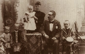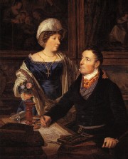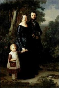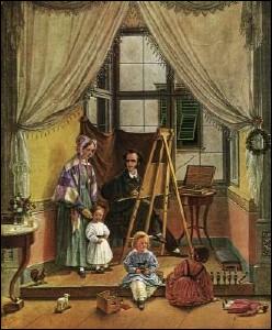 Auch die beiden folgenden Bilder passen nicht ins "Schema" (wenn es denn wirklich ein solches als ein allgemein anerkanntes gab und es nicht ein in der Rückschau angebrachtes Etikett ist): Da steht beide Mal die Frau und der Mann sitzt. Während im Bild von Waldmüller das Schreibzeug des Mannes und die Blumen in der Hand der Frau zumindest die Rollenverteilung verdeutlichen, fehlen diese Hinweise in der Fotografie. Es wird allerdings zu beachten sein, daß vor allem die Herstellungsbedingungen von Foto und Gemälde andere sind: Die (momentane) unterstützende Zuwendung der Mutter hat es vielleicht überhaupt erst möglich gemacht, daß die Fotografie in der vorliegenden (an die Gemälde angelehnte) Dreiecks-Komposition entstehen konnte - der Vater "opfert" seine Position der technischen Notwendigkeit, schließlich waren noch Belichtungszeiten von Sekunden und nicht von Hundertsteln erforderlich.