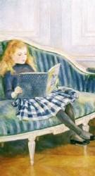 Diese kühlen Blautöne bilden in ihrer Gesamtwirkung um das lesende Mädchen herum eine eigentümlich abgeschlossene Sphäre. Marguerite liest. Sie läßt sich nicht stören, sie blickt nicht auf - sie liest. Sie hat sich allein auf dem großen Sofa eingerichtet, auf dem noch viel Platz ist, und ist in das blaue Buch vertieft, das mit zwei grünen Samtbändern verschlossen werden kann - eine Besonderheit. Ein besonderes Buch. Durch die innere Abgesondertheit von den anderen, durch die ihr zugeordnete Farbe befindet sich das lesende Mädchen zwar im gleichen Raum, im selben Zimmer - aber doch in einer anderen Welt!