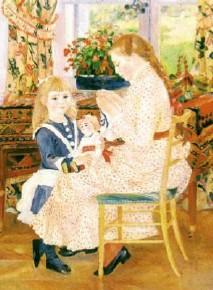 "Nachmittag der Kinder... In einem behaglich eingerichteten Zimmer sind drei Kinder versammelt: die zehnjährige Marguerite, die vierjährige Lucie und ihre große Schwester Marthe. Marthe näht - man könnte sie ihrer aufrechten Haltung und Statur wegen für älter, möglicherweise für das Kindermädchen halten. In Wirklichkeit ist sie damals eben vierzehn Jahre alt.