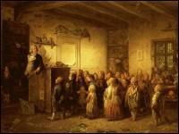 "Einer eigenwilligen und doppelbödigen Auseinandersetzung mit dem Schicksal des Lehrers begegnen wir in Johann Peter Hasenclevers 'Jobs als Schulmeister' aus dem Jahre 1845. Das Bild hat seine thematische Grundlage in einem damals in Bürgerkreisen viel gelesenen Versepos, der 'Jobsiade'. Er schildert das Leben des hoffnungsvollen Bürgersöhnchens Jobs, der, von seinen Eltern für Höheres bestimmt, nach einem abgebrochenen Studium sich auch eine Zeitlang als Schulmeister versucht.